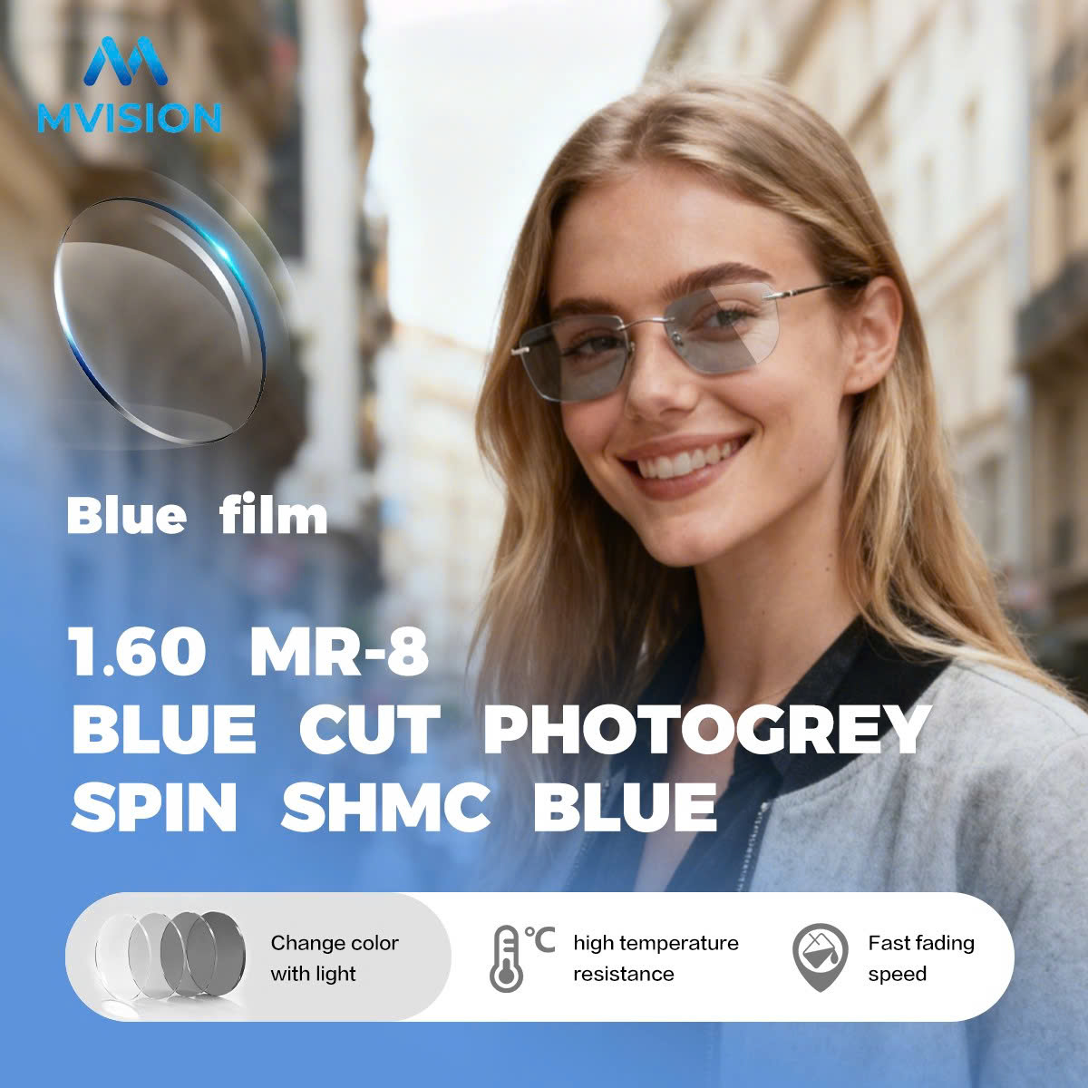 Tròng kính đổi màu 1.60 Nano Blue MVISION Singapore – Tròng kính lọc ánh sáng xanh